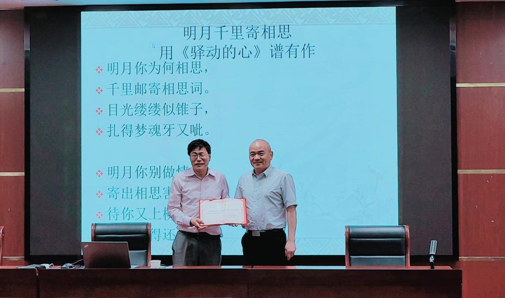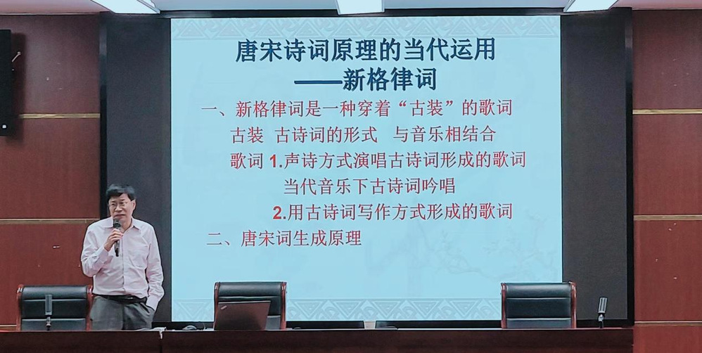 在讲座过程中,曹辛华教授首先分享了自己早年的诗词学习经历,他以杜甫《绝句》为例,讲授了如何诵读古典诗词,指出四声的组合使得中国诗歌具备了鲜明的音乐性,中国传统的朗诵方式是按照音韵节奏进行的。随后,曹教授详细解释了“徒诗”“歌诗”与“声诗”的不同含义,并结合《敢问路在何方》《成都》等现代流行歌曲的旋律即兴歌咏自己创作的诗歌,用生动形象的方式展示了“一曲唱千词、一词唱千曲”的艺术创作方式。充分展现古典诗词的音乐性、画面性、娱乐性等特点,实现古为今用、古今会通的目的,以此作为探索中国优秀传统文化传承的有效方式。并解释新格律词是一种穿着“古装”的歌词,简而言之,便是古诗词的形式与音乐的结合。最后,曹教授着重讲解了倚词填词,可按非歌词形式填词,亦可按流行歌曲歌词填词。曹教授提出,写诗、吟唱是鼓励自己、疏泄郁闷、表达情思的活动,鼓励同学们新诗入手大胆尝试写诗,并结合师范专业特点,将来以灵活生动的方式运用到教学中,吸引更多的孩子爱上诗词。