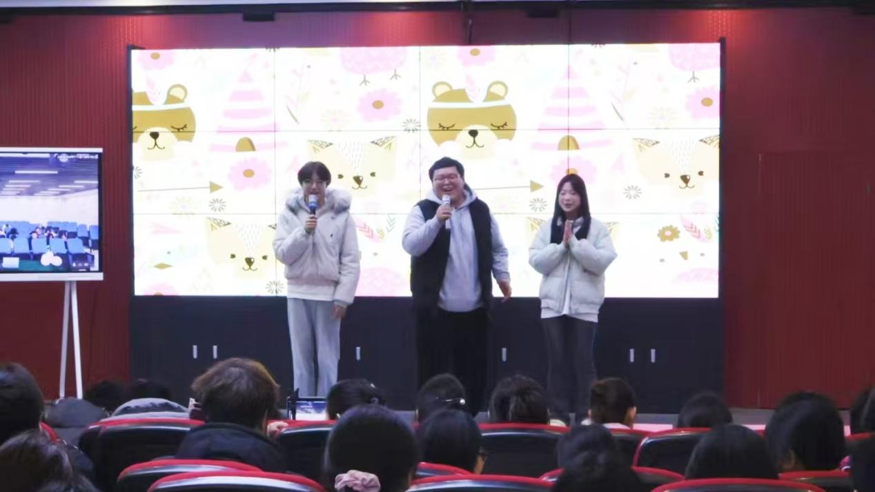 本次我院参赛选手分别为2024级小学语文教育班任玉婷、卢庆国和江瑞。比赛分为三个环节。在第一环节中,文化与传媒学院的“解忧大队”以幽默风趣的方式进行了自我介绍,以其独特的风格吸引了观众们的关注,赢得了热烈的掌声。第二环节是心理知识问答环节。文化与传媒学院的参赛选手们凭借扎实的心理学知识在这一环节中表现出色。最后一个环节是案例分析,2024级小学语文教育班卢庆国结合理论知识与实际案例,深入浅出地分析了案例中的心理问题,其表现赢得了评委们的一致好评。
